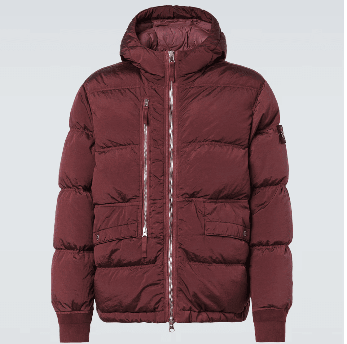 This paneled coat by Stone Island is filled with soft down, delivering superior warmth and reliable protection in extreme weather conditions. The burgundy design is complete with a drawstring hood, a two-way zipped front, and the signature Compass badge.